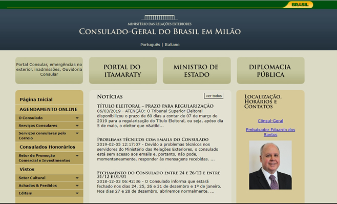 Portale italiano del consolato brasiliano, offre assistenza ai cittadini brasiliani all’estero, nonché raccomandazioni, avvertenze e avvisi.
